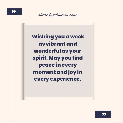 – Wishing you a week as vibrant and wonderful as your spirit. May you find peace in every moment and joy in every experience.